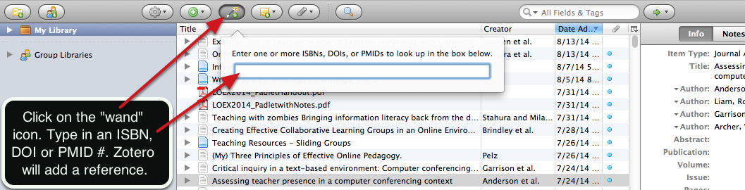 * You can simply drag and drop PDFs into Zotero and it will usually find the reference information. I advise against this though as it takes up some of your free Zotero cloud storage (300mb free. You can pay $20 a month for 2GB). I add via another method and use a cloud based solution (Google Drive but other solutions would work as well) to store the PDFs.